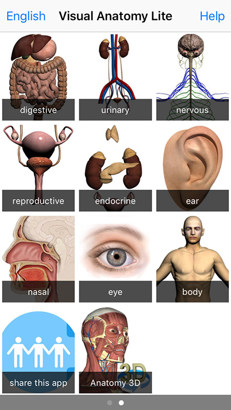 The Visual Anatomy Lite app launches without splash screen or logo and opens immediately with a simple interface showing 23 thumbnail images on two screens that feature various parts of the human anatomy and other app features. As you may see, the design is perhaps too simple, but I didn't want to judge it yet, at least until I check 3D illustrations and interactivity.