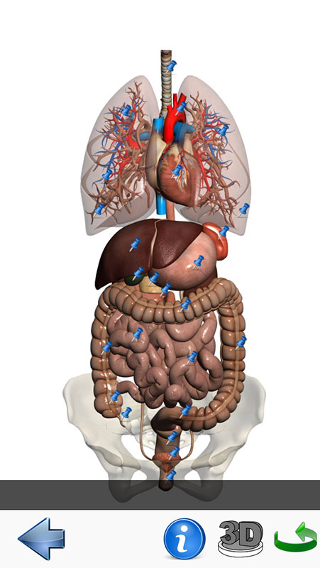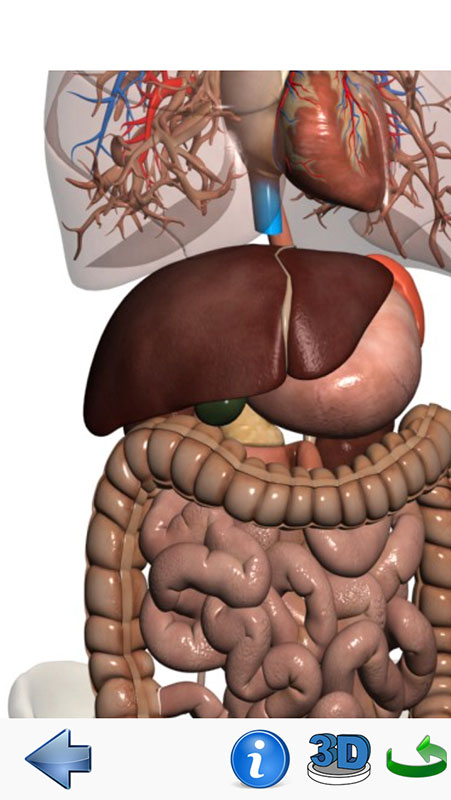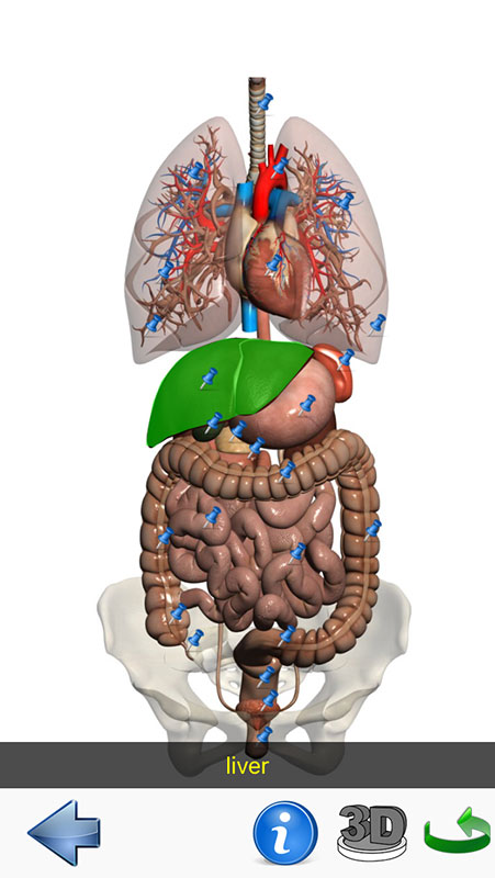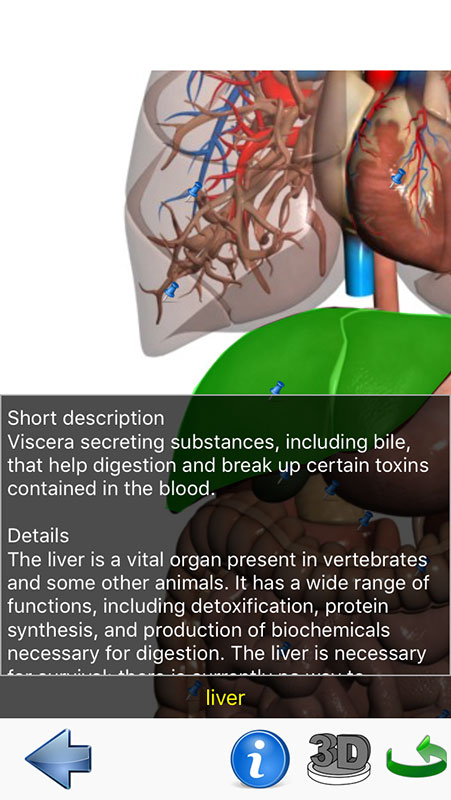 If you tap on particular body part/feature point, for example on liver in Organ 3D section, it will become green. You can then tap on Info button to get more information about the organ you've chosen, usually presented with short description and then in more detailed information on how it works below. In similar way, you can tap on any feature point and get relevant information.