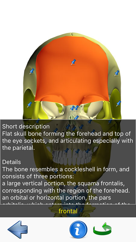 Using their fingers, users can zoom in for a closer look or rotate the image if the 3D view is enabled (by tapping on relevant icon). If 3D is disabled, you can rotate image by tapping on Rotating arrow icon, but it doesn't work so smooth. Also, when 3D view is enabled, feature points are not shown on the illustration and you can't get information.