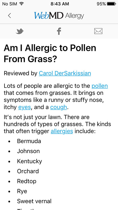 WebMD Allergy app doesn't require users to register an account as it used to, but you would be asked several questions in their Survey, particularly about medications you used last year if you're a mother with a child under the age 18, and about the allergy symptoms that bother you the most.