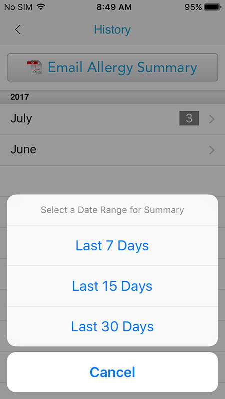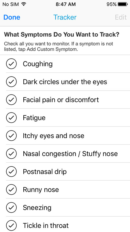 Allergy Tracker is another app's feature that most chronic allergy sufferers would find very useful. This tracker feature allows users to add moods, symptoms, and medications they want to track daily. Here, users can also add notes. Users can check previous entries (and edit them) by tapping on History.