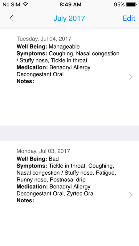 To my disappointment, the data you track isn't displayed in some sort of graph, which would be easy-to-view, but rather in a form of textual descriptions shown for each day. There is no way to see trends, commonly used medications, or compare moods and symptoms with particular weather/allergy forecast. Everything looks somehow bland and flat.