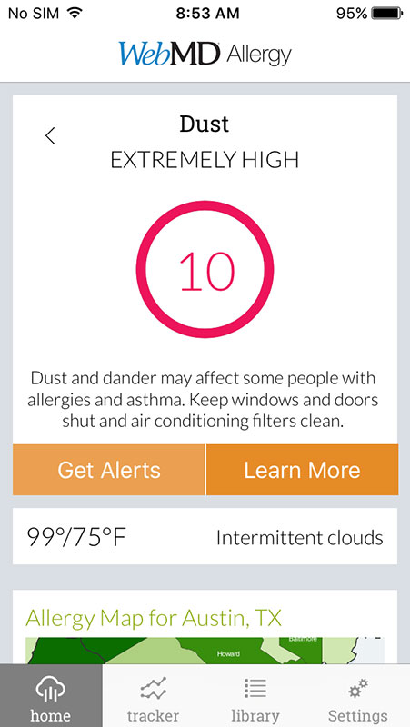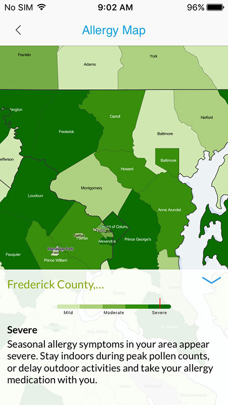 You'd see if there are alerts for Mold, Dust, Tree, Grass, and Ragweed, and if there are, the app would indicate their levels, including Low, Moderate, High and Extremely High, each featured with a different color. There is also a map of your location (city) with areas shown in lighter or darker green color indicating the severity of allergy symptoms.