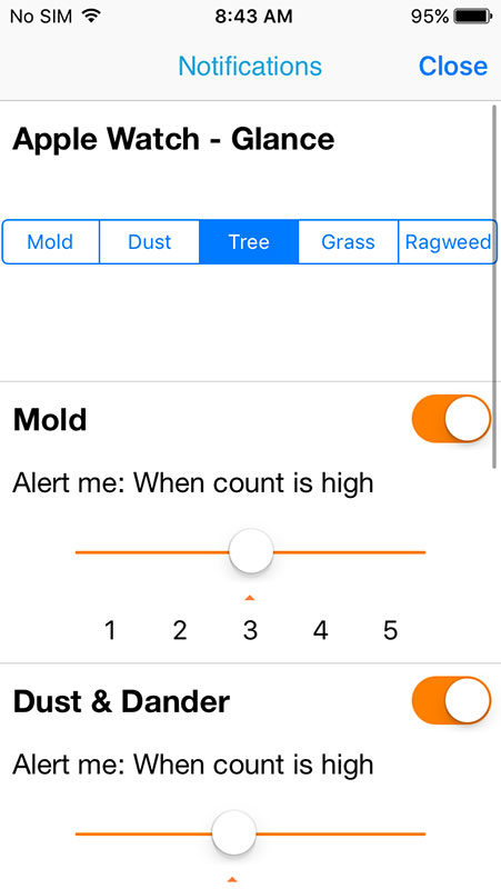 Another thing I liked is alerts that WebMD Allergy app sends to its users when the level of particular allergen is high, which can be set on a scale from 1 to 5.