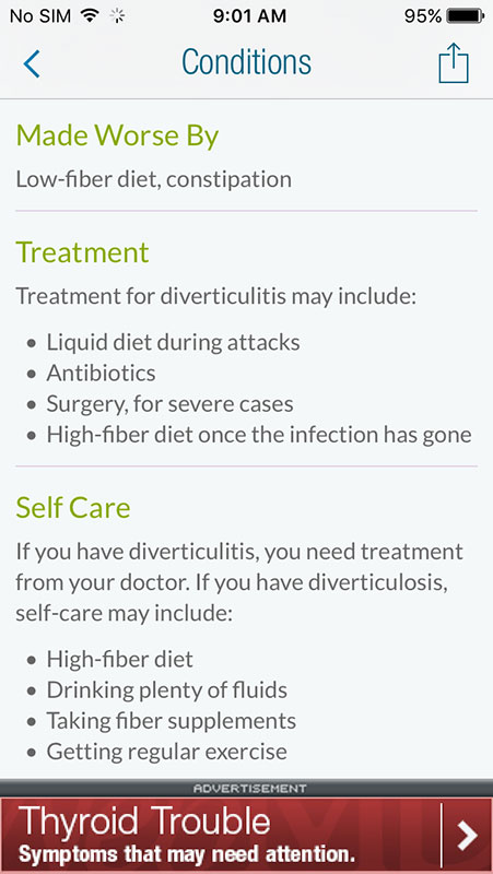 It is possible to personalize the app through the Healthy Living feature, but it requires users to sign up for a WebMD account. If you don't mind this, you can create custom lists of drugs you use, conditions you monitor, and medical articles that may interest you.
