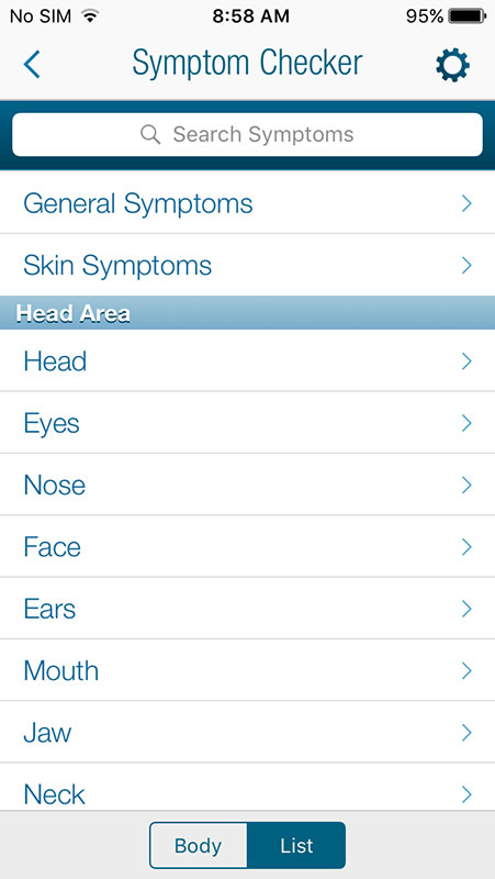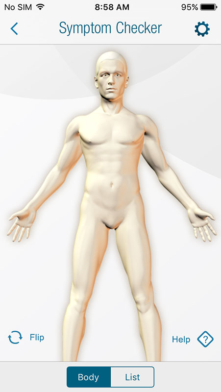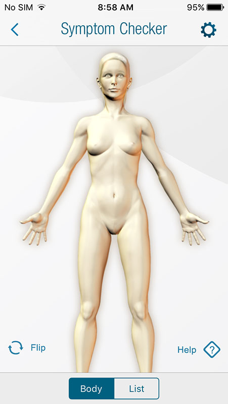 Before you can use the Symptom Checker, the app will require you to provide your ZIP, age and sex. The male or female body figure would appear, depending on the sex you've chosen. To look up the symptoms, just tap on the area of the body.