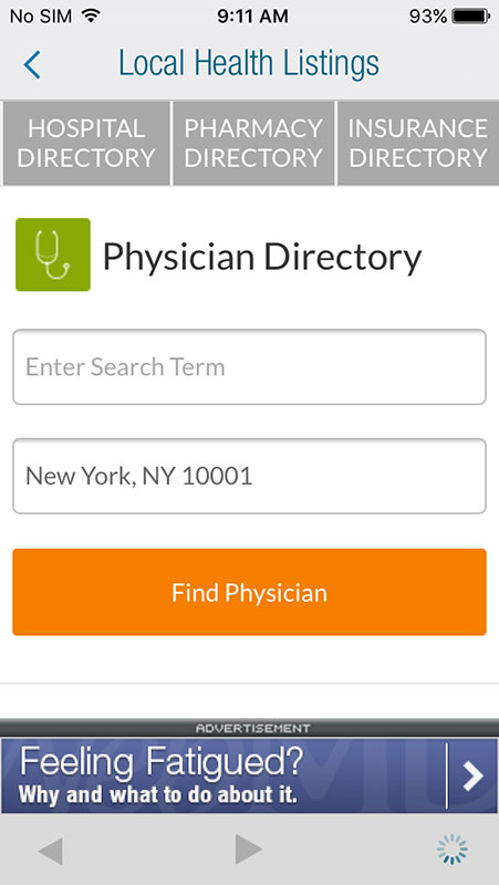 The app also includes Local Health Listings allowing users to find physician, hospital, pharmacy or insurance from several directories based on user's location. The patients can refill their prescriptions or transfer from their pharmacy, which is connected to Wallgreens and utilizes phone camera, allowing users to scan bar code on their medication package