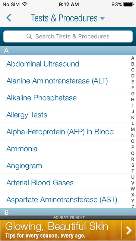 Conditions section contains information about various conditions, listed on a fairly extensive list that can be viewed alphabetically or by top searches. Information provided includes condition overview, causes, symptoms, and treatments.