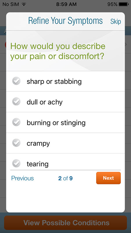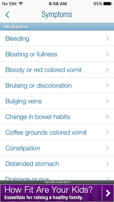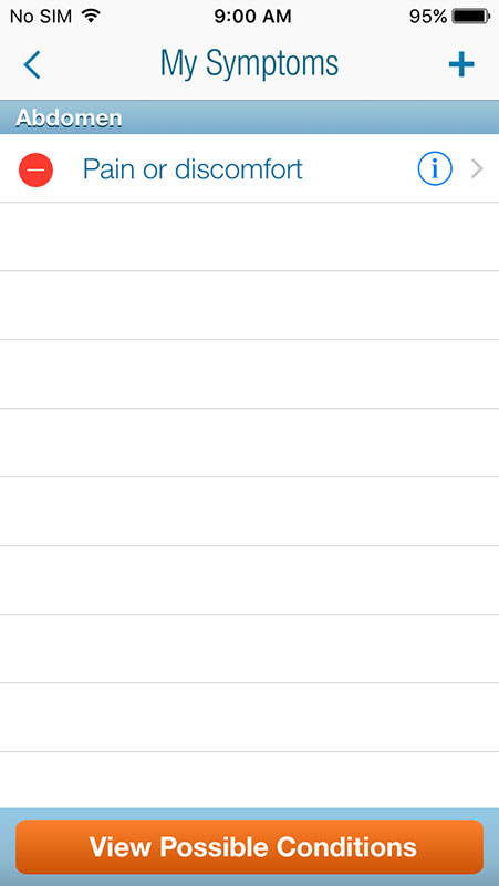 The app will provide you with a list of symptoms for that area (for example the abdomen). Tap on any symptom that is closest match to yours, and the app will help you refine it by taking you through the set of additional questions.