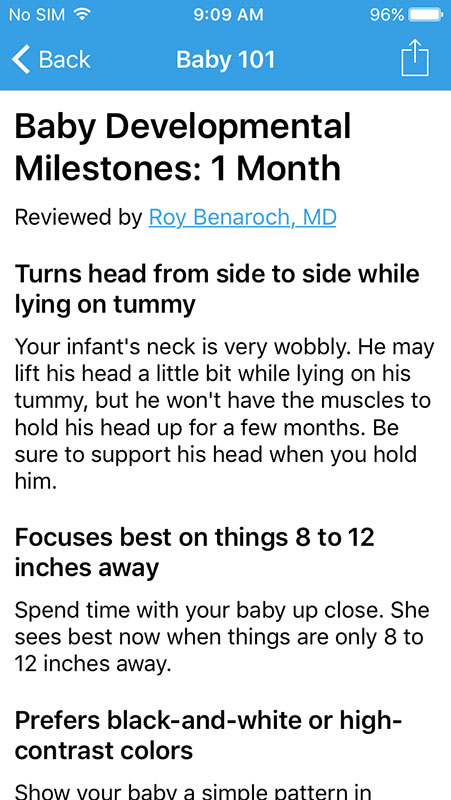Here, parents (or other apps users) can read various tips that also cover a specific period in baby's life. So here you may find anything, from breastfeeding tips, when to call a pediatrician, what to expect from your baby’s first exam.