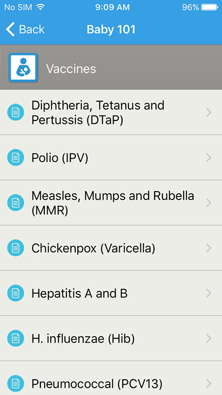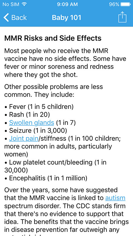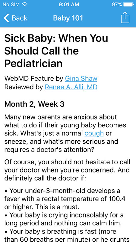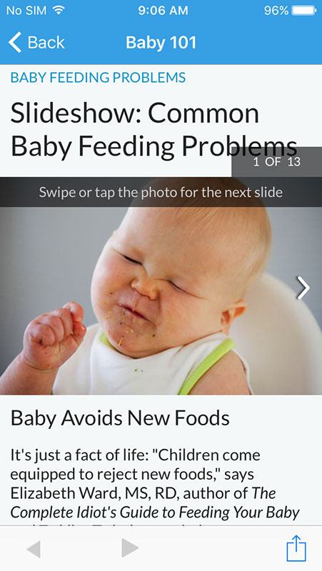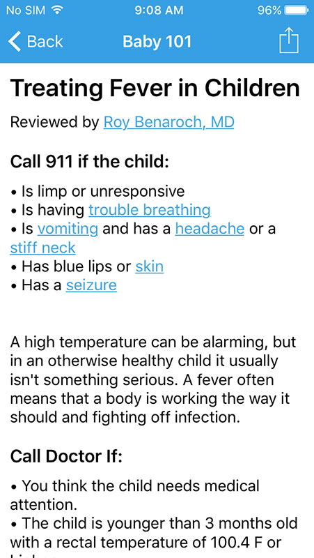 Articles open in the app, featuring comprehensive information that is presented in an easy-to-read, bulleted format. Each article is well-referenced, listing sources, such as American Academy of Pediatrics, KidsHealth website, individual pediatrician's, and more.