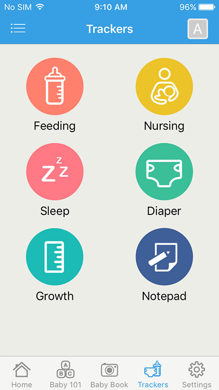 Trackers section features a couple of tracking tools, including trackers for feeding, nursing, sleeping, diapers, and growth.