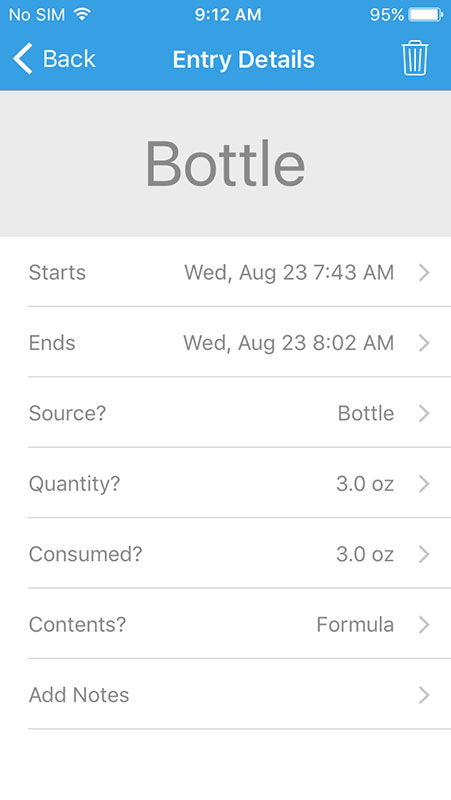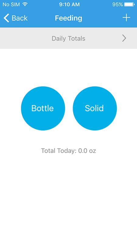 Feeding tracker has two options, Bottle and Solid, and whatever of them you choose, the app would ask to provide additional information, such as start and end time, source, quantity, etc.