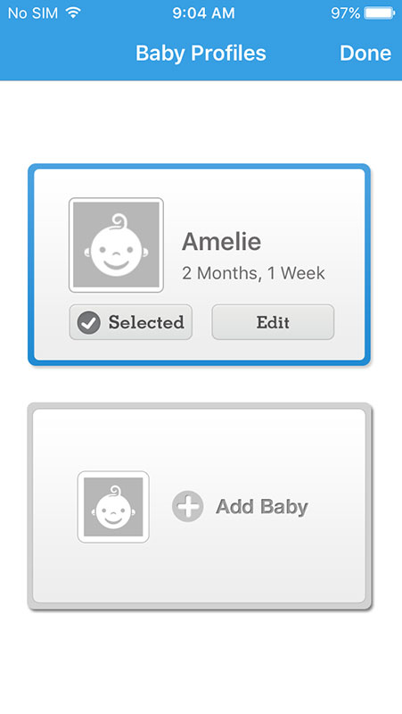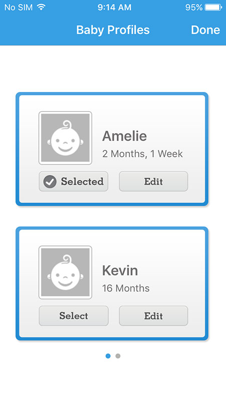 WebMD Baby supports multiple children so you can add them in Settings section or by tapping the letter on the top right in Trackers section, which also enables you to switch between babies at any time. The letter would change depending on which baby is active, i.e. A for Amelie, K for Kevin, etc.