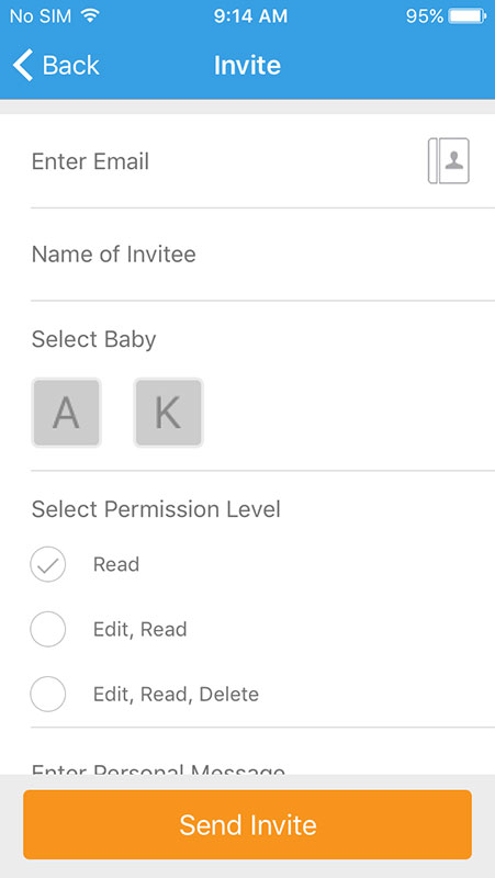 Finally, there's the Settings section where users can change the apps configurations or invite collaborators, who would be able to read or edit details about your baby (for example mom can invite dad or anyone else to collaborate).