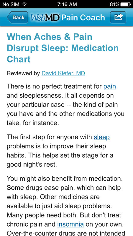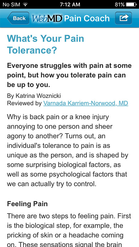 The app we review today is not that kind of app. WebMD Pain Coach app is made by healthcare professionals to help people who suffer from chronic pain. It is a medication-free app that provides daily tips, helps users set wellness goals and share their progress with their doctor.