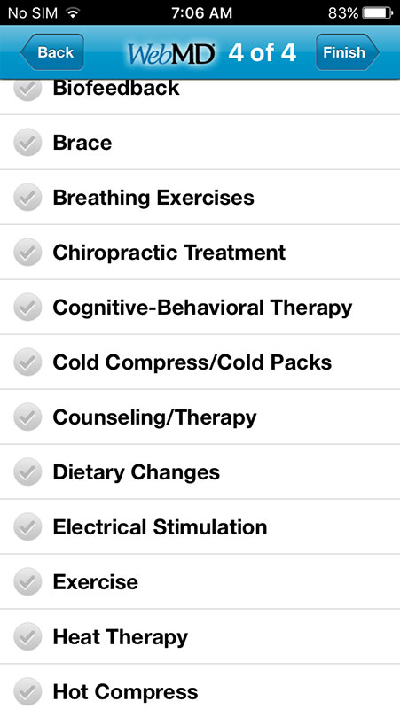 In the final step, the app would ask if you use any treatments, such as medications and supplements, or other treatments such as acupuncture, breathing exercises, chiropractic treatment, CBT, meditation, rest, yoga, and so on. These alternative treatments can be added by checking them in the list.